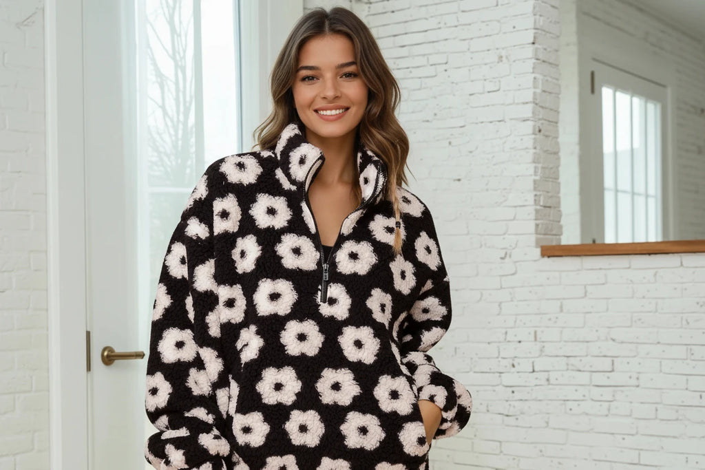 Snuggle up in this cheerful quarter-zip sherpa jacket, complete with a sweet daisy print that brings instant joy to your wardrobe. The soft, plush sherpa fabric wraps you in warmth while the relaxed fit makes it perfect for everything from coffee runs to cozy nights in. A playful layer that feels as good as it looks.