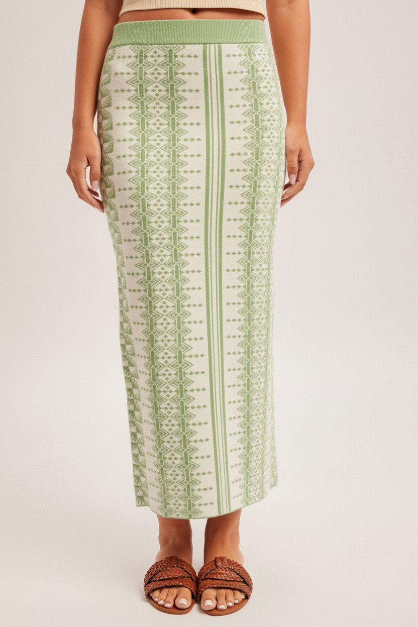 Elevate your everyday style with this eye-catching geometric print sweater midi skirt. The fitted silhouette and vertical patterning create a flattering, elongating effect, while the solid waistband offers a clean finish. Crafted for comfort and movement, this piece pairs effortlessly with fitted tops, oversized sweaters, or tucked-in blouses. Style it with the matching Geometric Print Sleeveless Sweater for a combo that is totally adorbs.