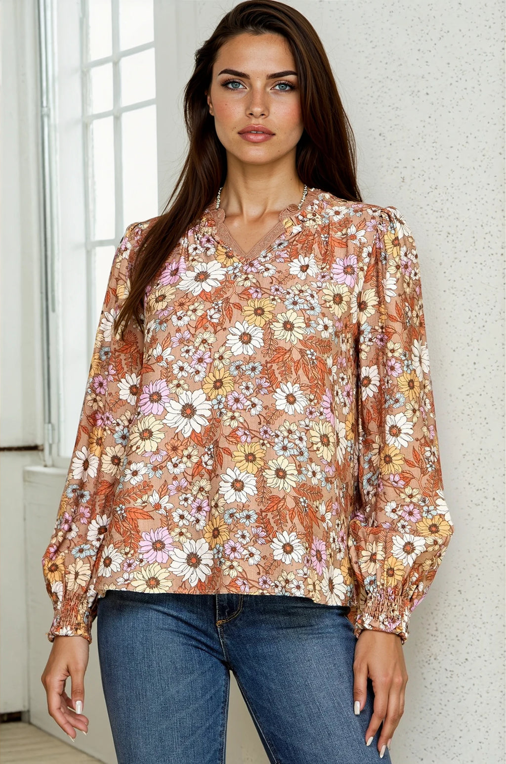Refresh your wardrobe with the Ruffle Neck Floral Blouse, featuring a ruffle V-neckline and smocked long sleeves. The relaxed fit and lightweight fabric provide all-day comfort, while the soft ecru base with multicolor blooms adds feminine flair. A versatile style, this top is perfect for pairing with denim or dressy bottoms.