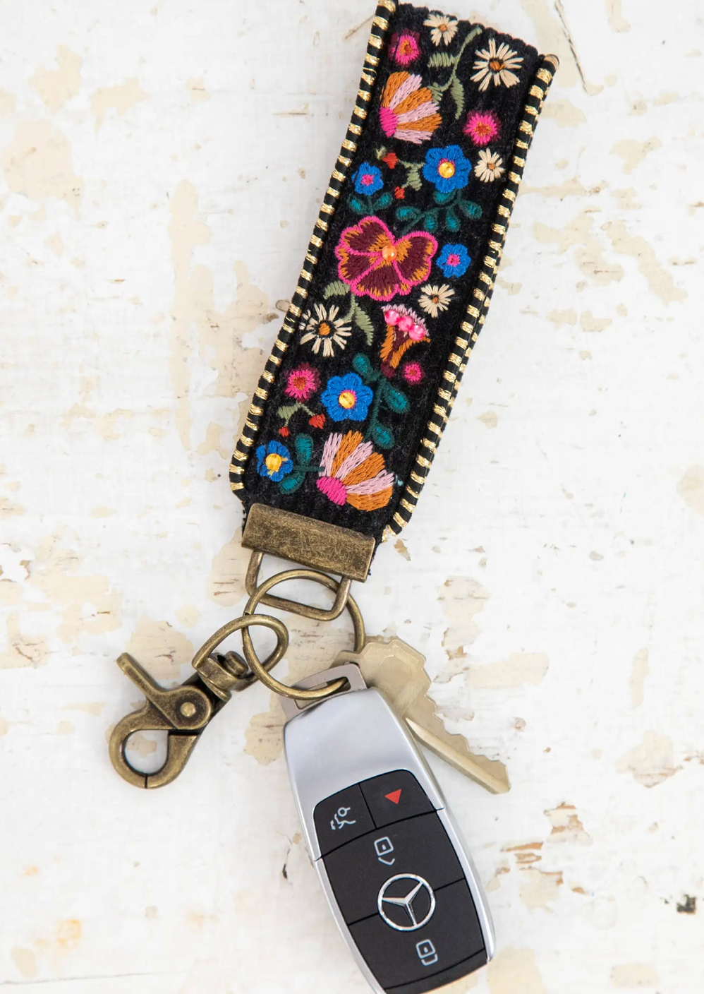 Adorable key fob features custom embroidered trim on a sturdy canvas backing, an antiqued brass key ring and lobster clasp to easily clip to your bag or belt loop