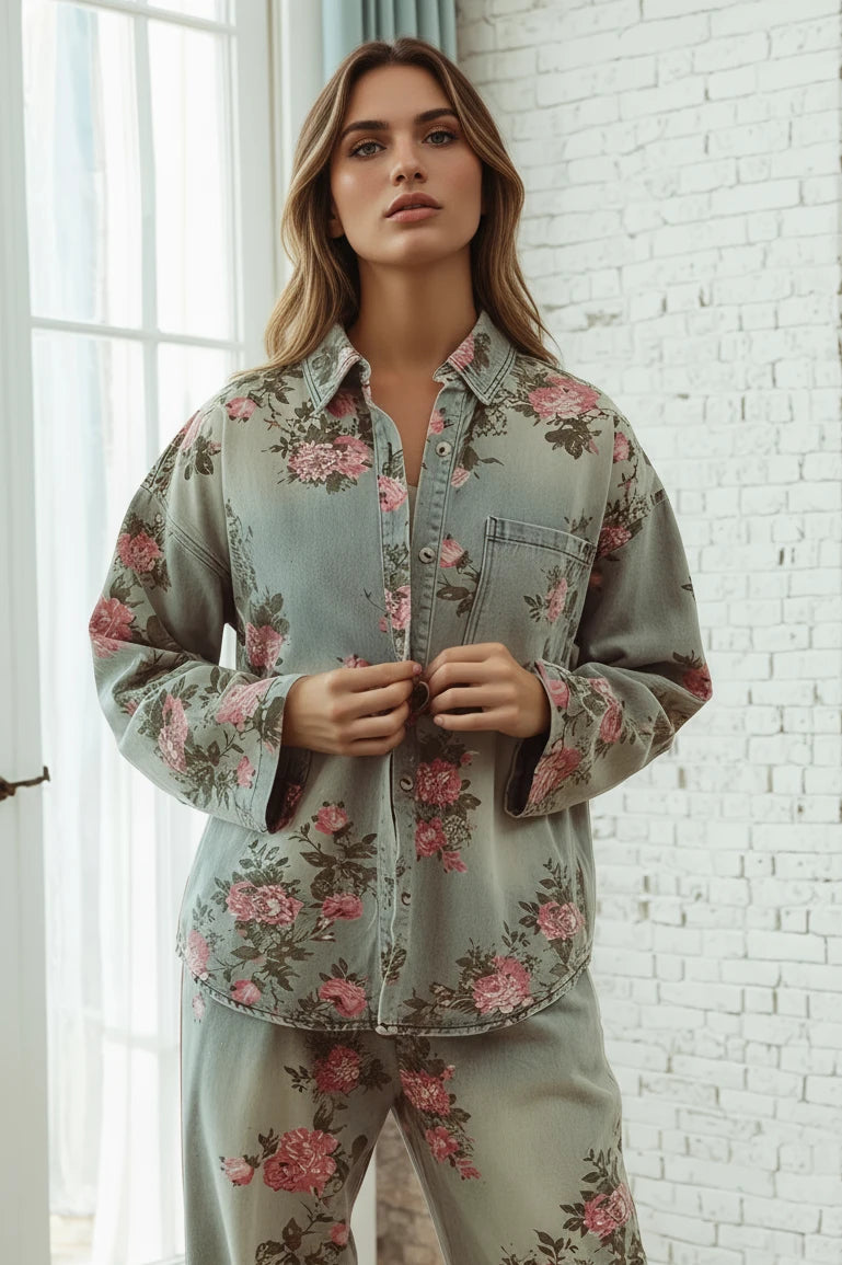 Adorable floral print on lightweight denim fabric...makes the perfect button down for all seasons.