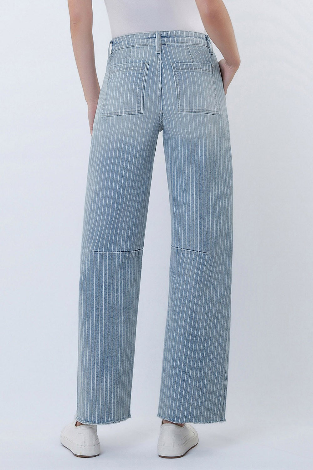 Turn heads in these high-rise striped barrel jeans that blend comfort with undeniable cool. The cropped silhouette and raw hem create an effortlessly modern look, while the stretch denim keeps you comfortable all day. Patch pockets add function to the fun. Perfect for anyone who wants their denim to do the talking.