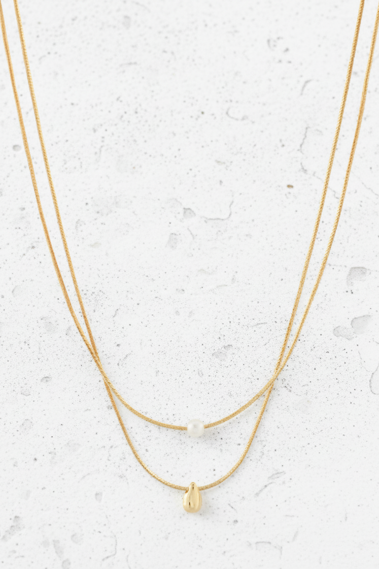 Two layered snake chain necklace with pearl charm and teardrop charm.