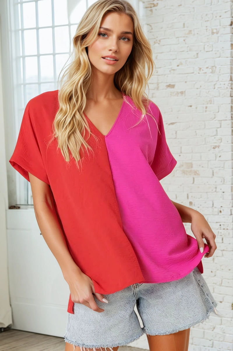 Loose Colorblock Top - Red/Pink