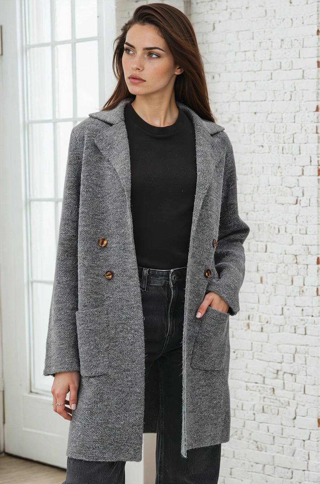 Layer up with effortless style in this open coatigan that's basically a sweater and coat rolled into one fabulous piece. Double-breasted buttons add a polished touch, while front patch pockets keep your hands happy and your look put-together. Cut to a flattering knee length, it's the perfect throw-on for transitional weather or when you want to add instant dimension to any outfit. Cozy meets chic.