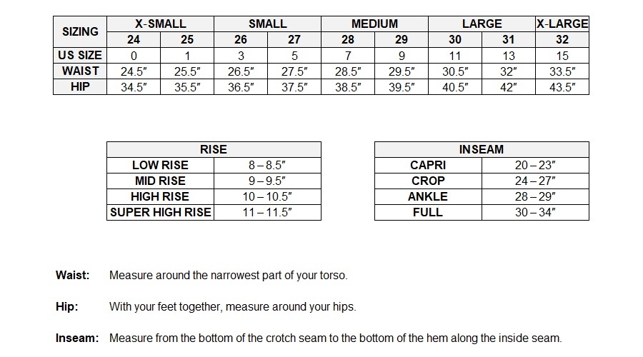 - Front Rise: 11" / Inseam: 32" / Leg Opening: 25"