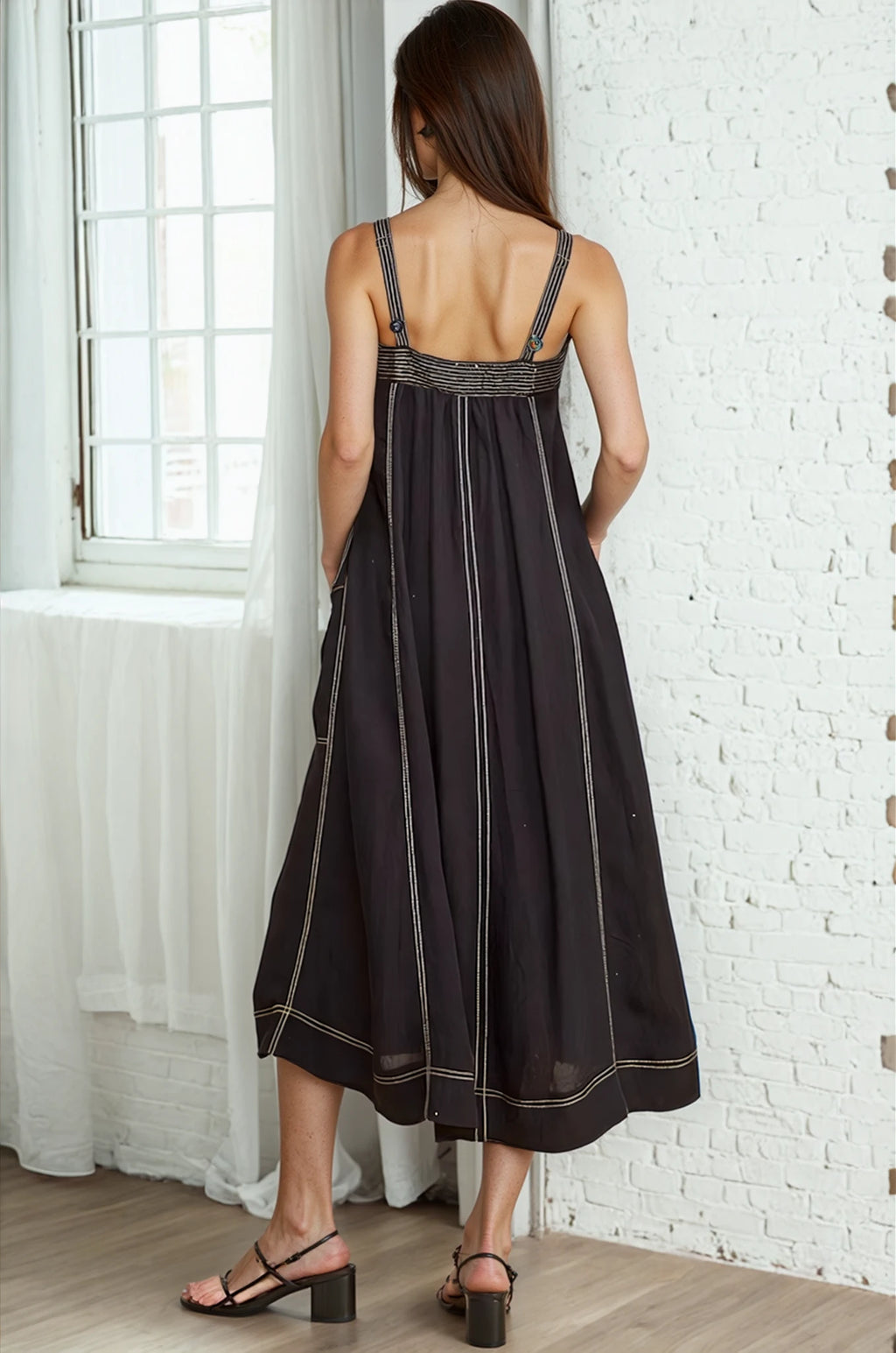 Black maxi dress with bold contrast stitching details. Perfect for effortless style that works anywhere, anytime.